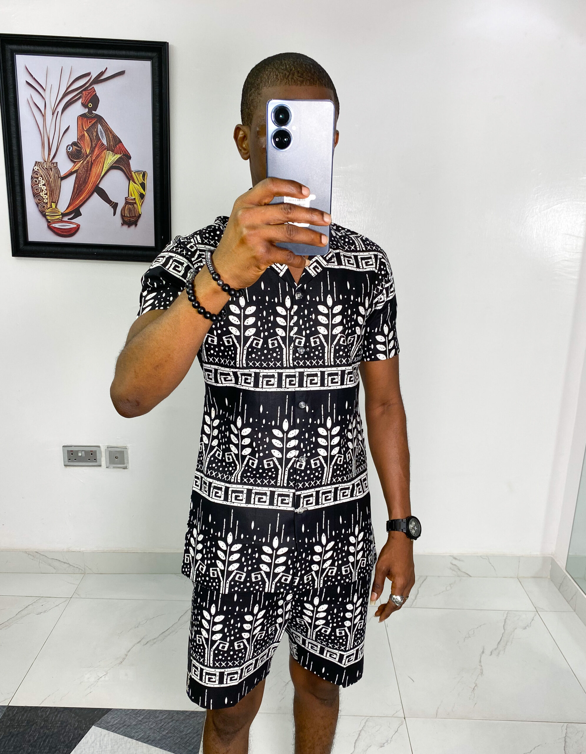 An ankara shirt, and a pair of matching shorts;
